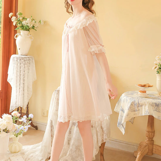 Slessic Double-Layer Mesh Embroidered Lace Cute Bow Short Nightdress